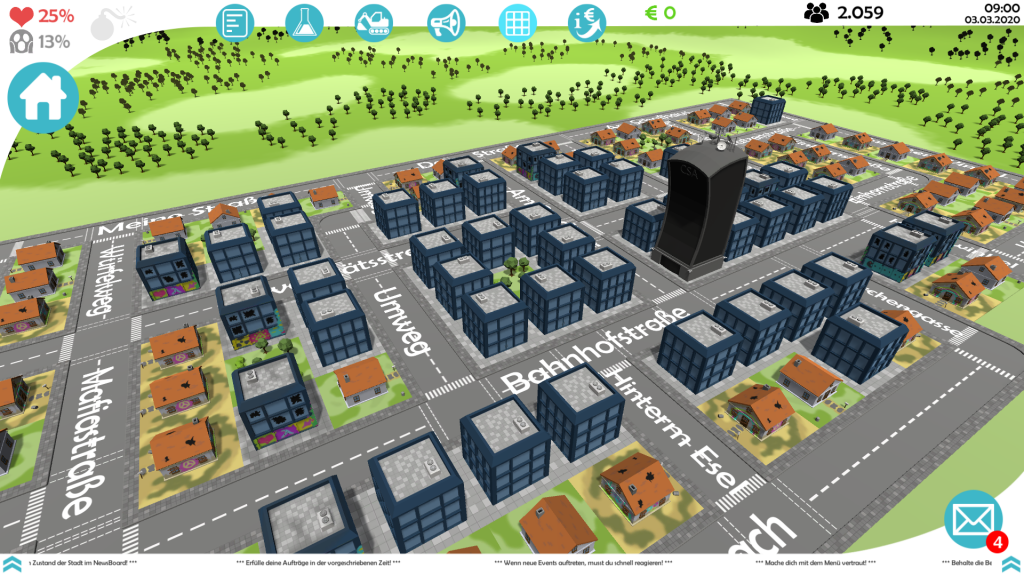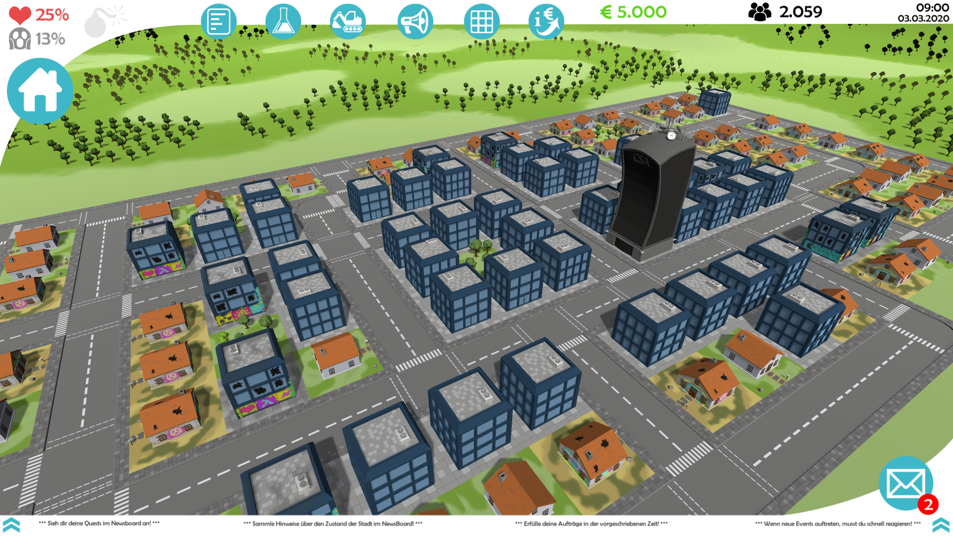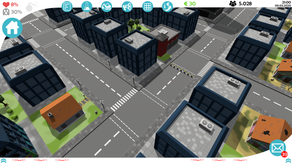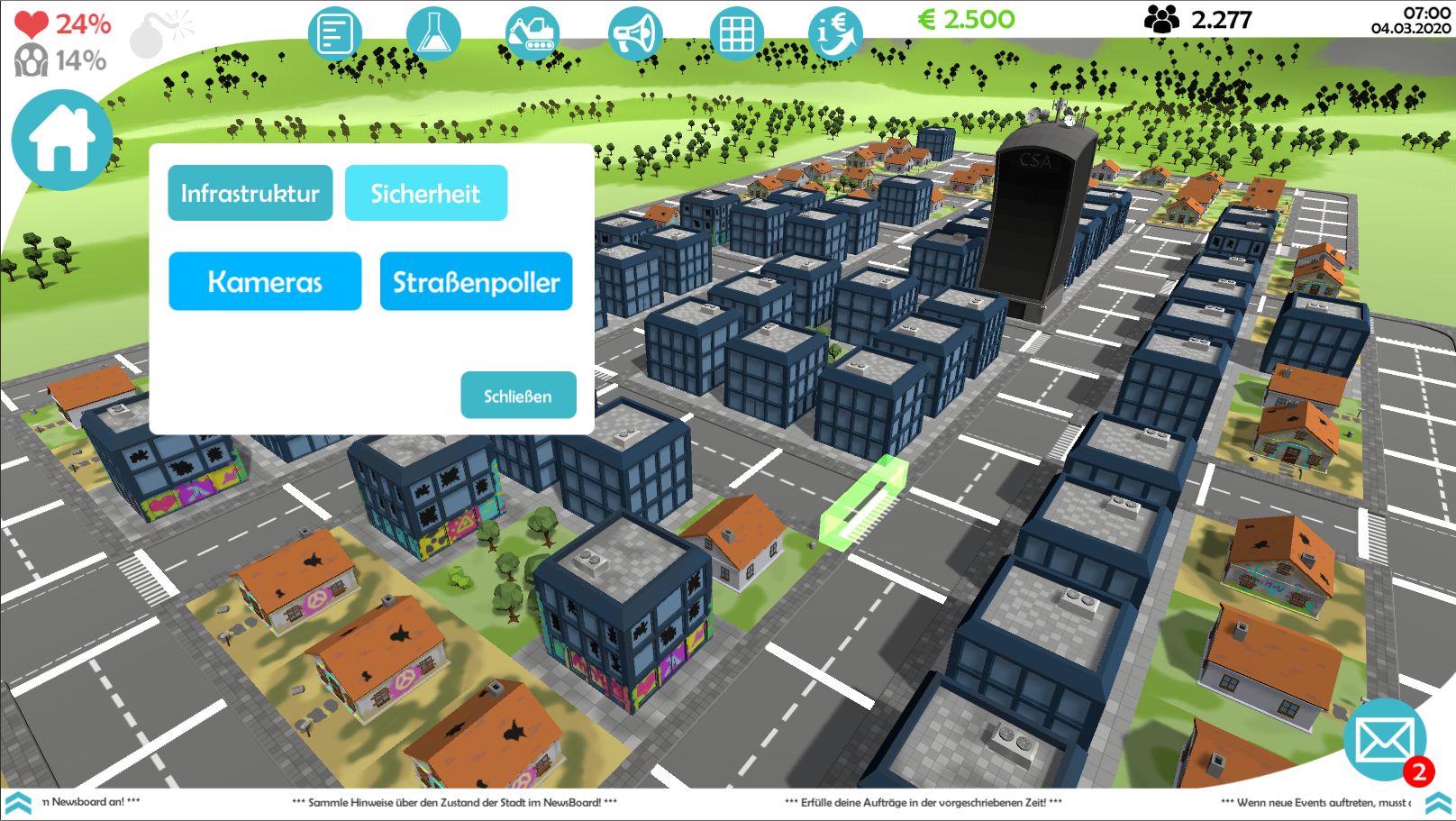 In our second and third semester during our master’s degree we have the chance to work on a project in each semester. In our third semester we decided to work with strategy games about surveillance. So in a group of again four teammates we assigned tasks to each with Trello. So one teammate developed the User Interface, another one designed the database, and so on. My task was the placement for placeable objects like cameras and the functionality of these objects. Other tasks were the functionality of the information windows of the houses and infrastructure and the modelling of the fire department and the police station. Our goal was a prototype where you can use every shown interface and interact with every house.