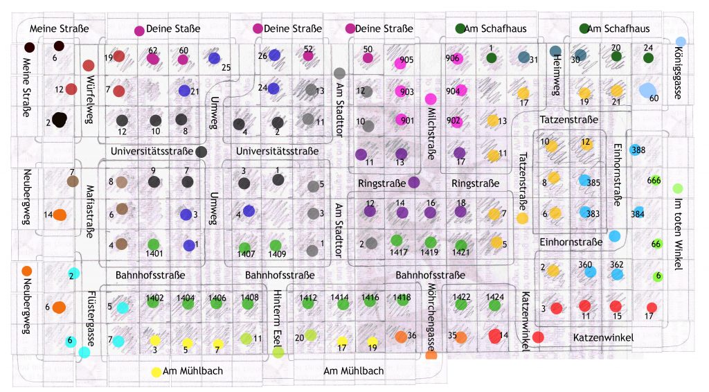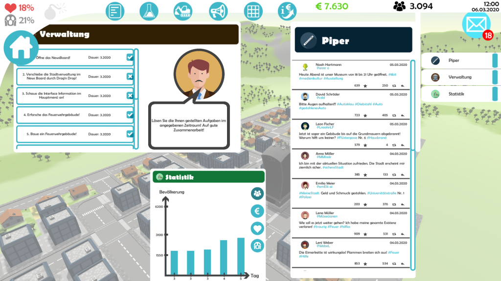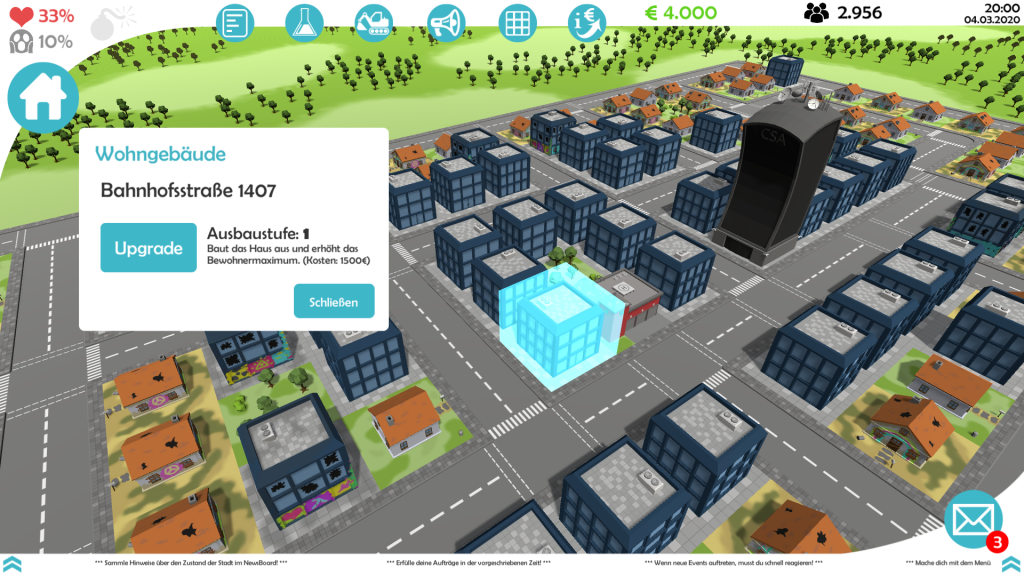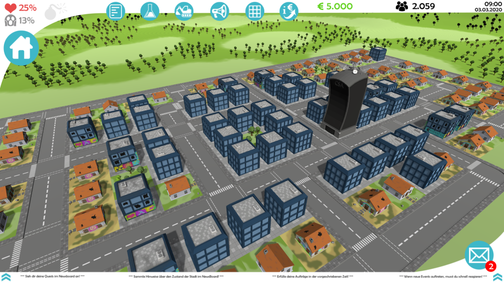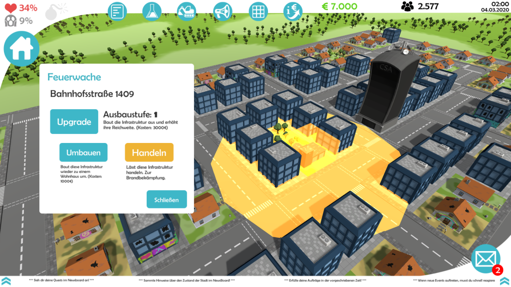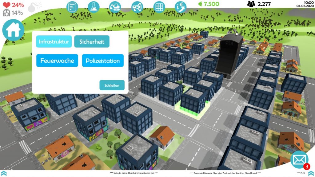 In our second and third semester during our master’s degree we have the chance to work on a project in each semester. In our third semester we decided to work with strategy games about surveillance. So in a group of again four teammates we assigned tasks to each with Trello. So one teammate developed the User Interface, another one designed the database, and so on. My task was the placement for placeable objects like cameras and the functionality of these objects. Other tasks were the functionality of the information windows of the houses and infrastructure and the modelling of the fire department and the police station. Our goal was a prototype where you can use every shown interface and interact with every house.