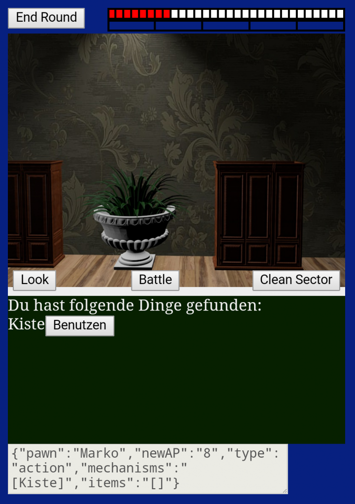 For the final assignment in the course „Game Design“ in the winter semester 2014/15 we created a game called „Blackditch“ with 5 other classmates. The purpose of the course was the conception of a new game. This game is a sort of board game. There must be one computer as a serverhost which will host the board and the players can join via the clientversion with their smartphones. This serverbased game was made with Unity 4. The clientversion was made with html and TypeScript, a different version of javascript.
